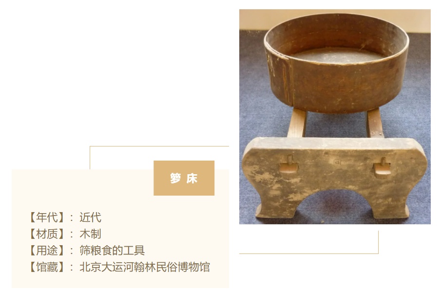 大运河翰林民俗博物馆珍藏的箩床就是典型的代表箩床,由支架、箩磨床子、箩筐子三部分构成,箩筐子的帮是用木片围成圆形,底部细铁丝网的缝隙可筛落面粉;箩磨床子是用两根长方形木条,两头穿入两块木板内做成,木板下头锯出两个三角形腿。