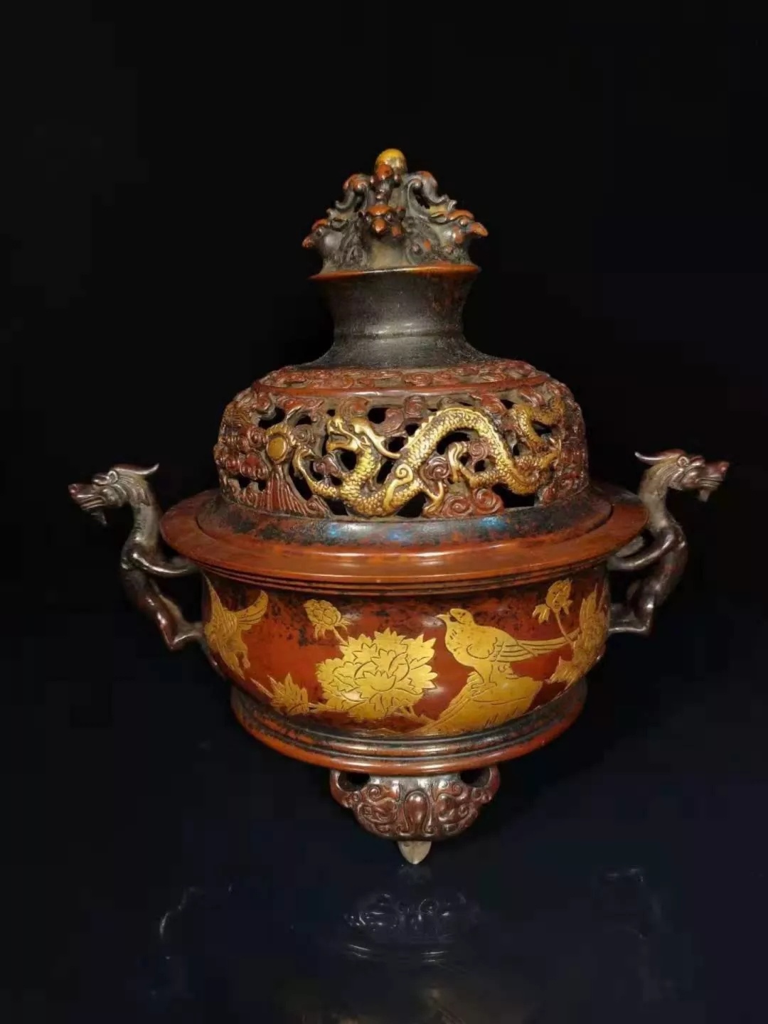【详述】炉型摹古,侈口,颈部收束垂腹,下承三兽足,镂雕云龙纹器盖,盖面隆起,顶饰四凤首为摘钮,彰显炉之雍容华贵之气。两条躬身回首螭龙,怒目四足盘于炉身两侧做耳,气势磅礴。器壁精作花鸟纹饰,繁复华丽,雍容典雅。此器造型古拙典雅,线条曲直有致,金水一流,底蕴浓润,视之丰腴,抚之绵细,为文房雅室陈设赏玩之佳器。