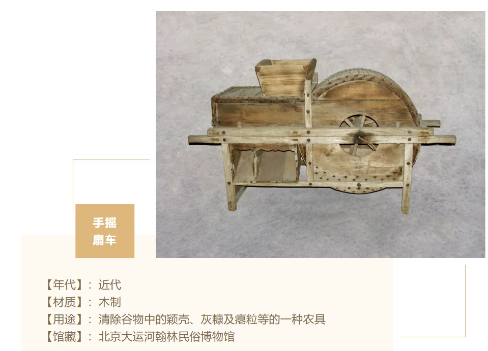大运河翰林民俗博物馆珍藏的手摇扇车属于封闭式扇车,出粮效率高。扇车由车架、外壳、风扇、喂料斗、出风口及出粮口等构成,主体结构为木制,进风口位于轴侧,出风口在径向,出风口与扇轮之间为分离室。