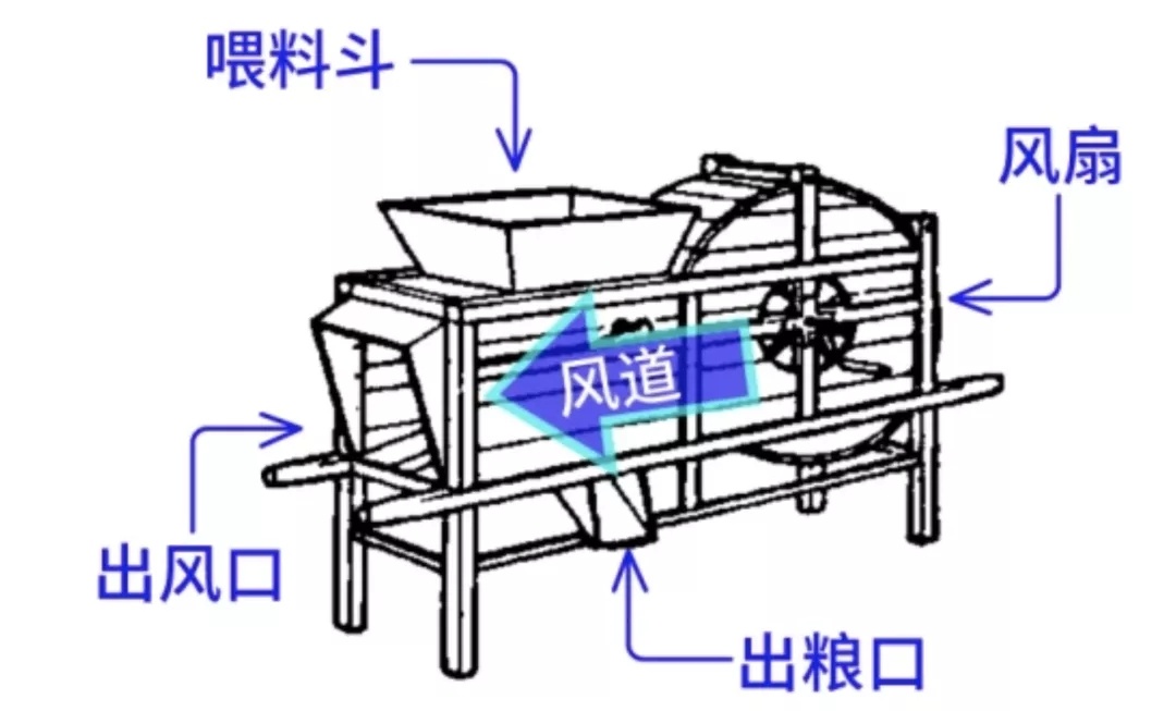 公元前2世纪,中国人就发明了旋转式扬谷扇车,扇车由车架、外壳、风扇、喂料斗以及调节门等构成,是现代农业机械普及以前机械化程度很高的农具。