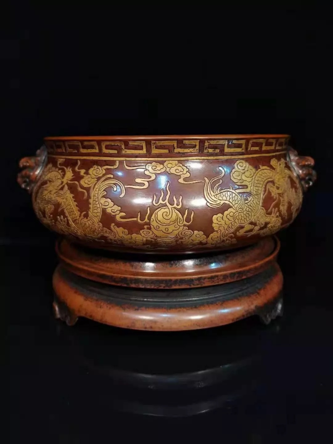 【详述】炉唇口微侈,敛颈,溜肩,鼓腹圆垂,圈足外撇,造型典雅古朴。口沿饰回纹一周,肩腹两侧分饰双狮首耳,鬃毛翻卷,双目圆睁,气势威严。器腹满工錾刻精作双龙戏珠纹,鳞片细密,身姿矫健,辗转腾挪,穿梭云雾,威武凌厉,鎏金装饰,雍容典雅。下设束腰卷云纹三足承座,与器身浑然一体,彰显炉雍容典雅之气度。整器深沉肃穆,沉稳端庄,狮耳转折自然流畅,炉身线条流畅利落,铜质厚实,叩之金声玉振,气韵清逸,局部鎏金,蜡茶色皮,包浆醇厚,温润古朴,为文玩清供之佳器。